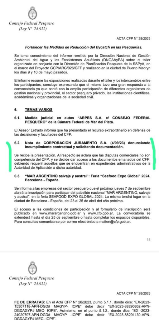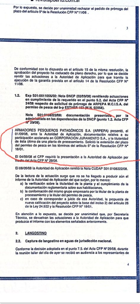 Otro incumplimiento que permitió el consejo federal pesquero con el buque Esther 153 , incumplió el contrato , con el grupo económico corporación juramento s.a , nos reunimos con la presidenta de corporación juramento para , recopilar información de estas maniobras y ella denunció a la firma armadores pesqueros , en el consejo federal pesquero , y en las oficinas de pesca capital federal dejando unas denuncias en dichas oficinas , fue atendida por por el director de pesca en ese momento y negaron , que corporación juramento , era parte del grupo económico , adjuntamos actas del consejo federal pesquero , pero sin embargo niegan verbalmente , que Arpepa tenga vinculación con dicha firma , sin embargo , bajo el número de acta ….. respalda esta información , en la cual ya está denunciada , hubo mediaciones , con dicha firma , pero Arpepa reconoce su deuda y su incumplimiento , pero se encuentran tranquilos, porque el poder del sobre , hace que esta gente siga operando , sin haber presentado los certificados de re proceso y sin permiso , renovado , por la empresa corporación juramento , a la victima de esta empresa le sacaron los libros al fallecimiento de su papá , su contadora Julieta sempio y su abogado Víctor Brond , junto a parte de la familia , le sacaron los libros poniendo firmas , de otras personas , que no eran socios , dando rienda suelta , a esta firma armadores pesqueros , cabe destacar , que María Lorena elguero , es una de las victimas , de toda esta gente ya que perdió su frigorífico , y quedó en la calle , así empezó esta terrible maniobra , donde la despojaron. De todo , siguiendo por pequeña marina y dicho equipo de “profesionales “.